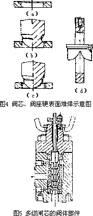 一般情況下,材料越硬,抗蝕能力越強,但至今仍沒有找到長時間抵抗嚴重氣蝕作用而不受損害的材料。因此,在有氣蝕作用的情況下,應該 考慮到閥芯、閥座易于更換。目前,制造閥芯、閥座的材料從抗氣蝕的角度出發(fā),國內(nèi)外使用廣泛的是司鈦萊合金、硬化工具鋼和鈷鎢合金鋼,特殊的表面要進行硬化處理。當用司鈦萊合金時,可在這些不銹鋼基體上進行堆焊和噴焊,以形成硬化表面。按不同的使用條件,硬化表面可局限于閥座、閥芯和閥座的封線處,也可 以在整個表面或閥芯導向處(見圖4)。